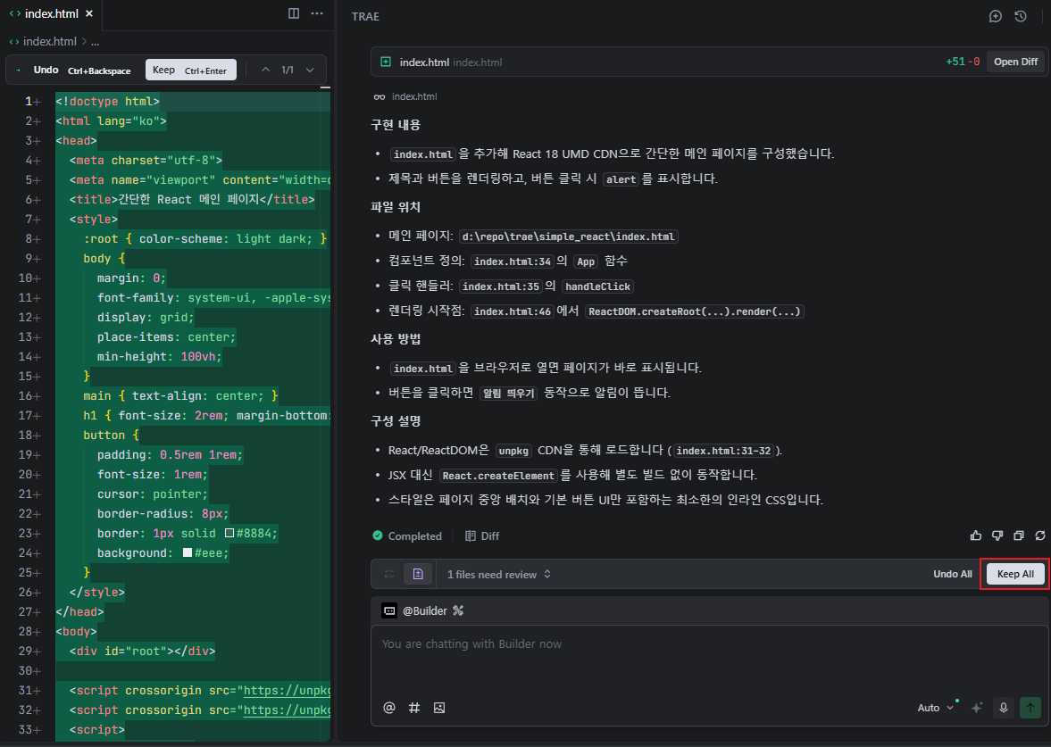 이 글에서는 Windows 환경에서 Trae AI 설치 → React 웹 앱 생성 → 실행까지