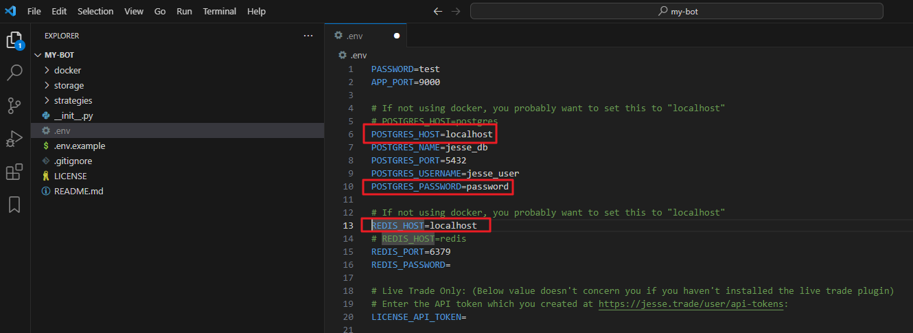 PostgreSQL 및 Redis 설정 항목을 .env 파일 내에서 수정합니다.