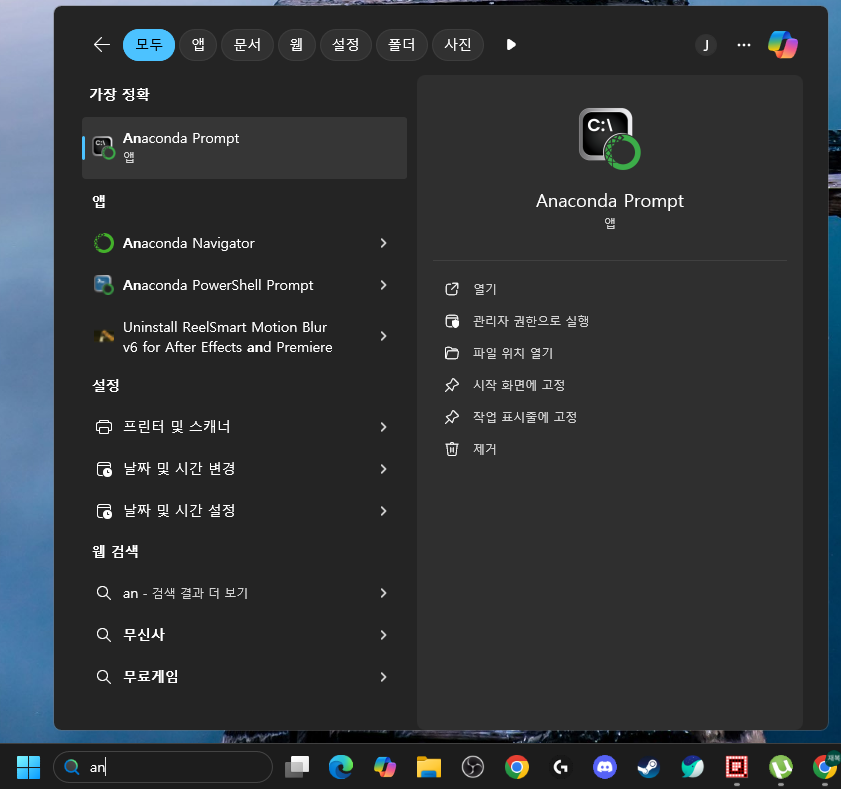Windows 검색에서 anaconda 라고 치면 Anaconda Prompt 가 표시됩니다.