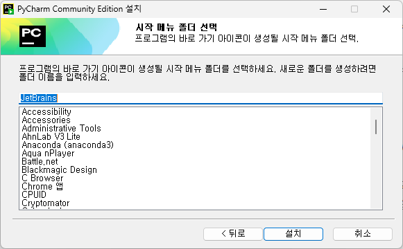 위 변수를 체크해도 되며 PyCharm 실행 시 바탕화면이나 Windows 메뉴에서 PyCharm 선택 후 실행해도 되기 때문에 저는 선택하지 않았습니다.