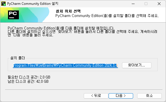 제가 다운 받을 때는 설치 파일은 pycharm-community-2024.3.4.exe 이였고 용량은 570MB 정도 였습니다.
