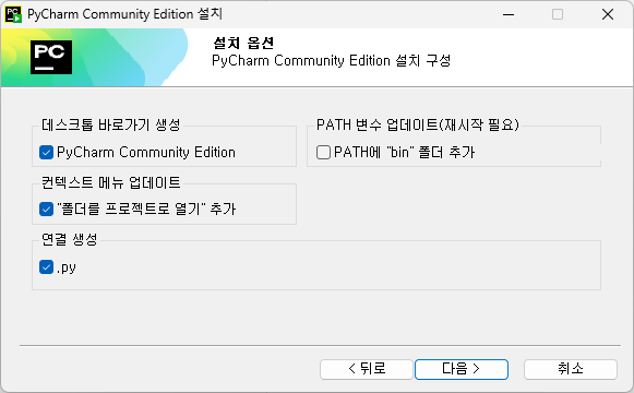 [컨텍스트 메뉴 업데이트]는 마우스 오른쪽 버튼을 누를 때 PyCharm 관련 메뉴가 나타나게 해줍니다.