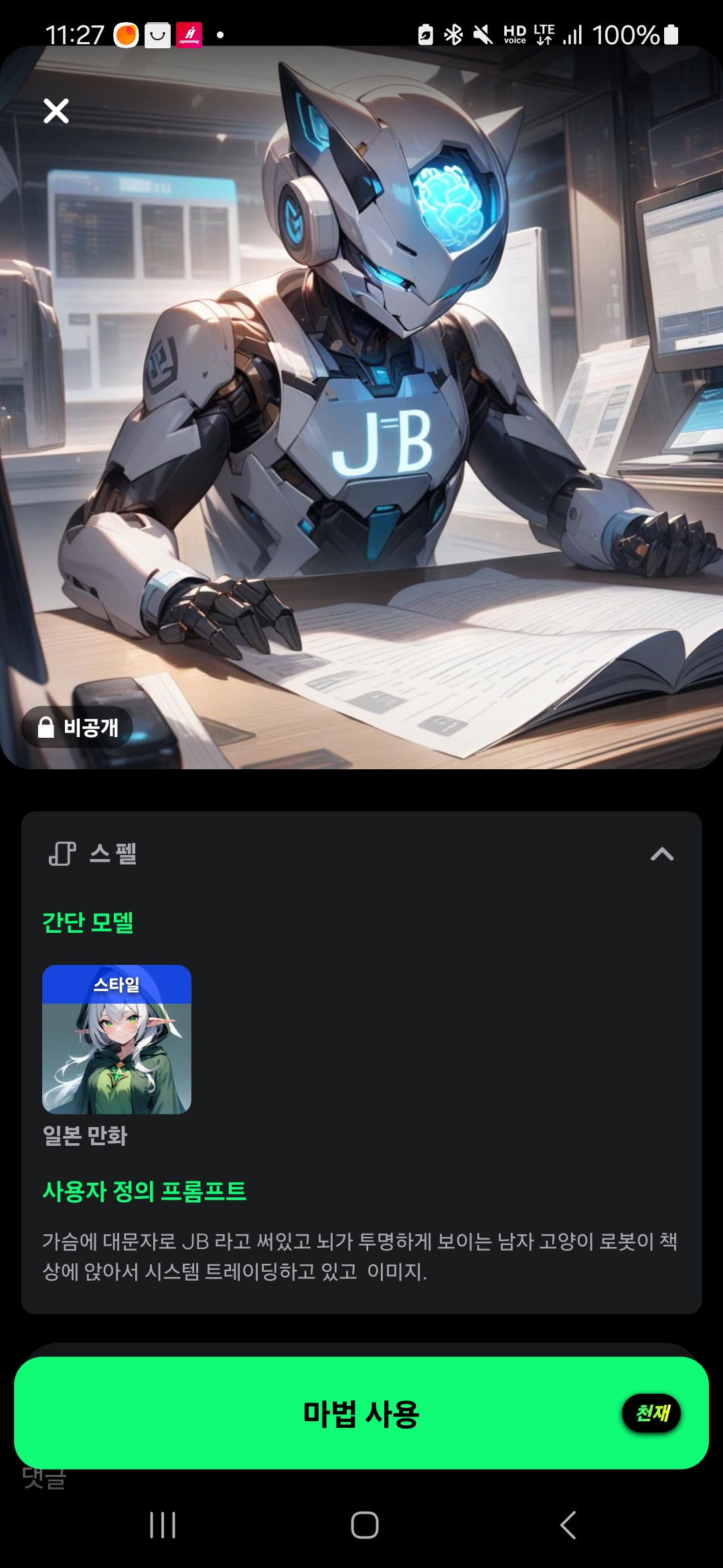 가슴에 대문자로 JB 라고 써있고 뇌가 투명하게 보이는 남자 고양이 로봇이 책상에 앉아서 시스템 트레이딩하고 있는 이미지