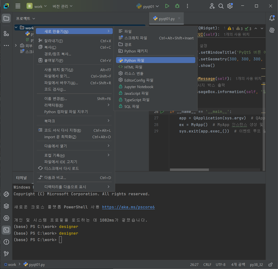 이제 pyqt02.ui 와 이를 연결할 파이썬 파일을 생성합니다.