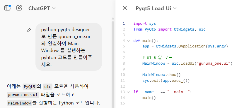 python pyqt5 designer 로 만든 guruma_one.ui 와 연결하여 Main Window 를 실행하는 pyhton 코드를 만들어주세요