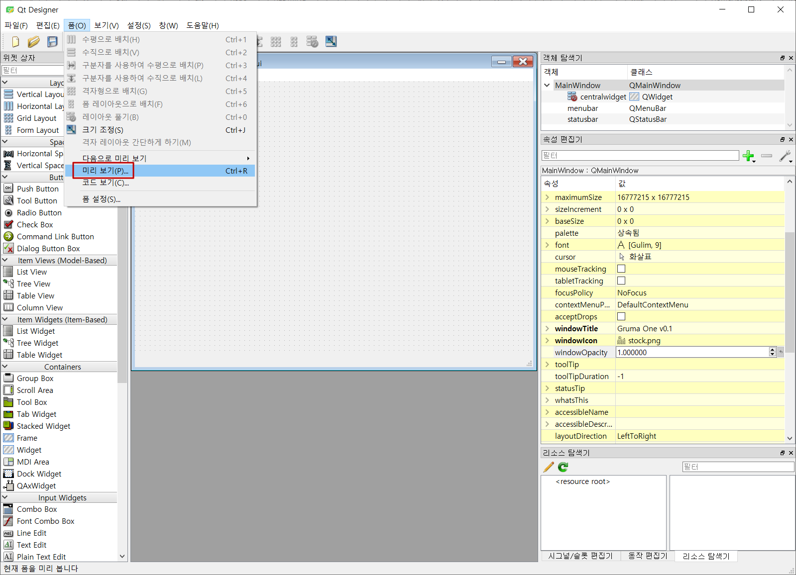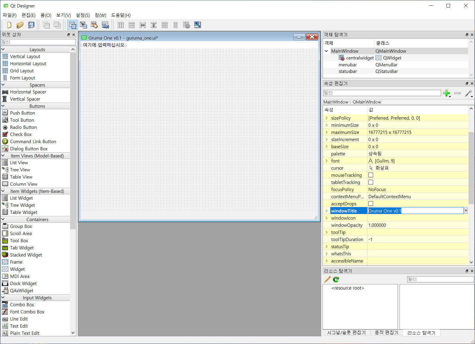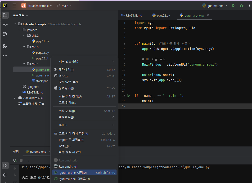이제 pyqt5 designer 로 만든 guruma_one.ui 파일과 연결하여 Main Windows 를 실행하는 python 파일을 만들차례 입니다.