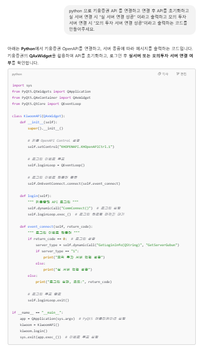 python 으로 키움증권 API 를 연결하고 연결 후 API를 초기화하고 실 서버 연결 시 "실 서버 연결 성공" 이라고 출력하고 모의 투자 서버 연결 시 "모의 투자 서버 연결 성공"이라고 출력하는 코드를 만들어주세요.