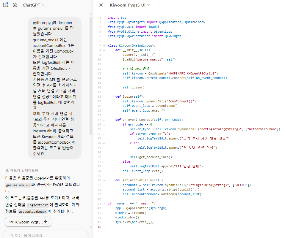 키움증권 API 를 연결하고 연결 후 API를 초기화하고 실 서버 연결 시 "실 서버 연결 성공" 이라고 메시지를 logTextEdit 에 출력하고