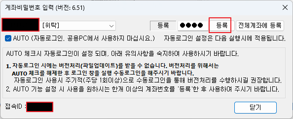 계좌 비밀번호를 입력하고 등록을 클릭하고 AUTO(자동 로그인) 을 선택합니다.