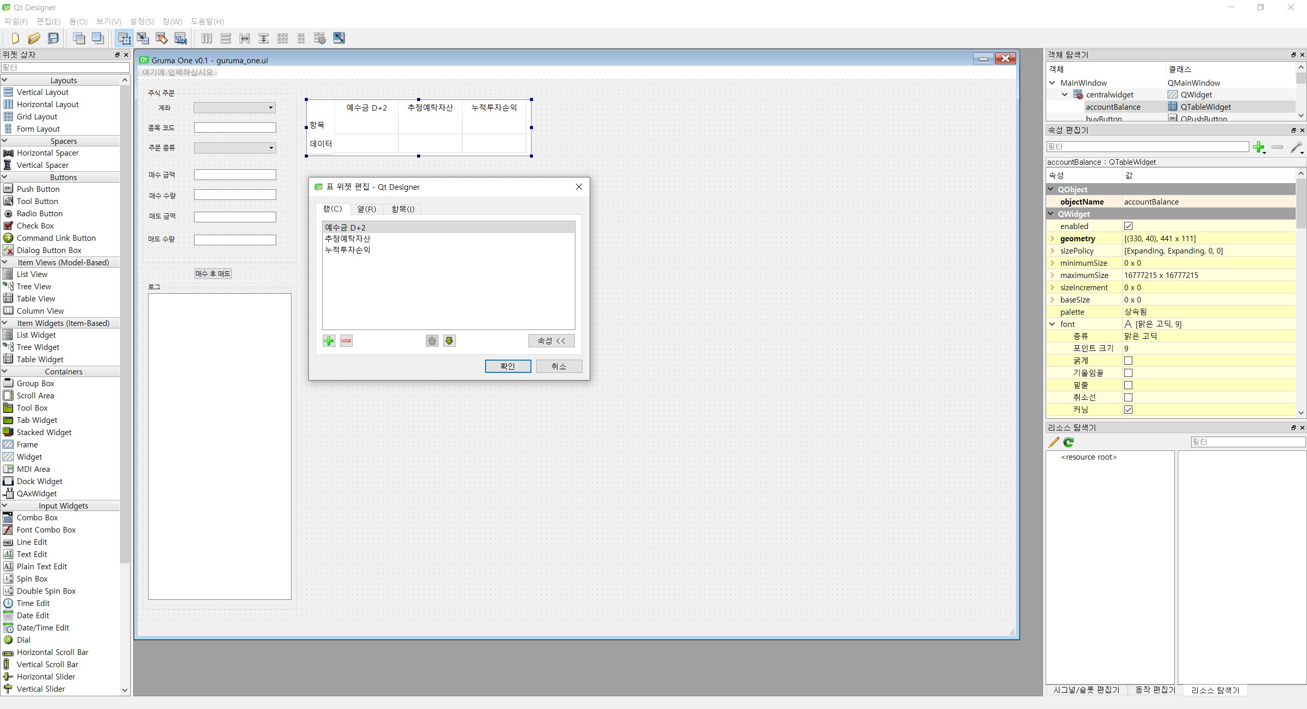 Qt Designer 로 잔고 조회를 위한 Table Widget 을 추가합니다.