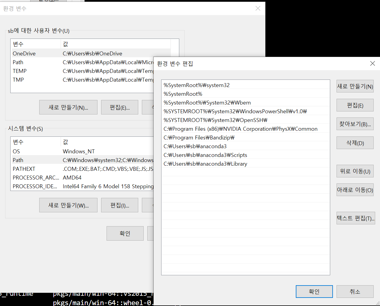 anaconda3 설치 후에 3개의 폴더가 path 에 설정되어 있어야 합니다.