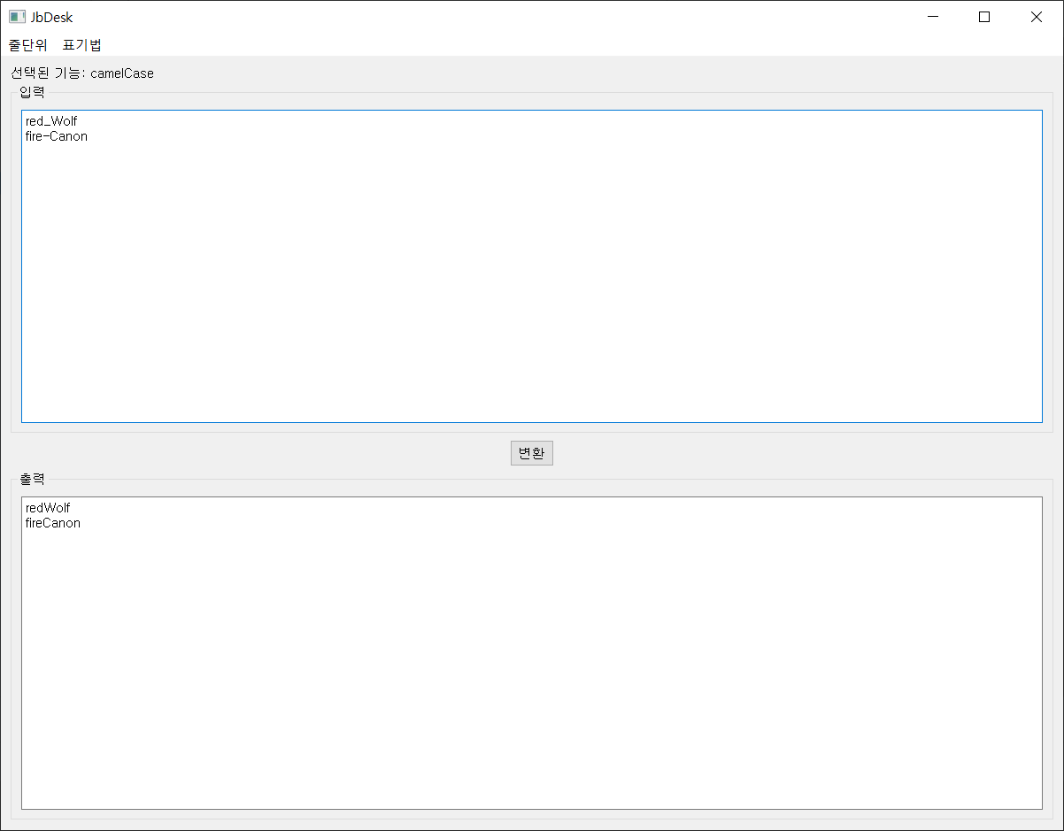 "camelCase" 를 선택하고 "변환" 버튼을 누르면 "입력" 의 text 의 camelCase로 변환하여 "출력" text 에 표시합니다.