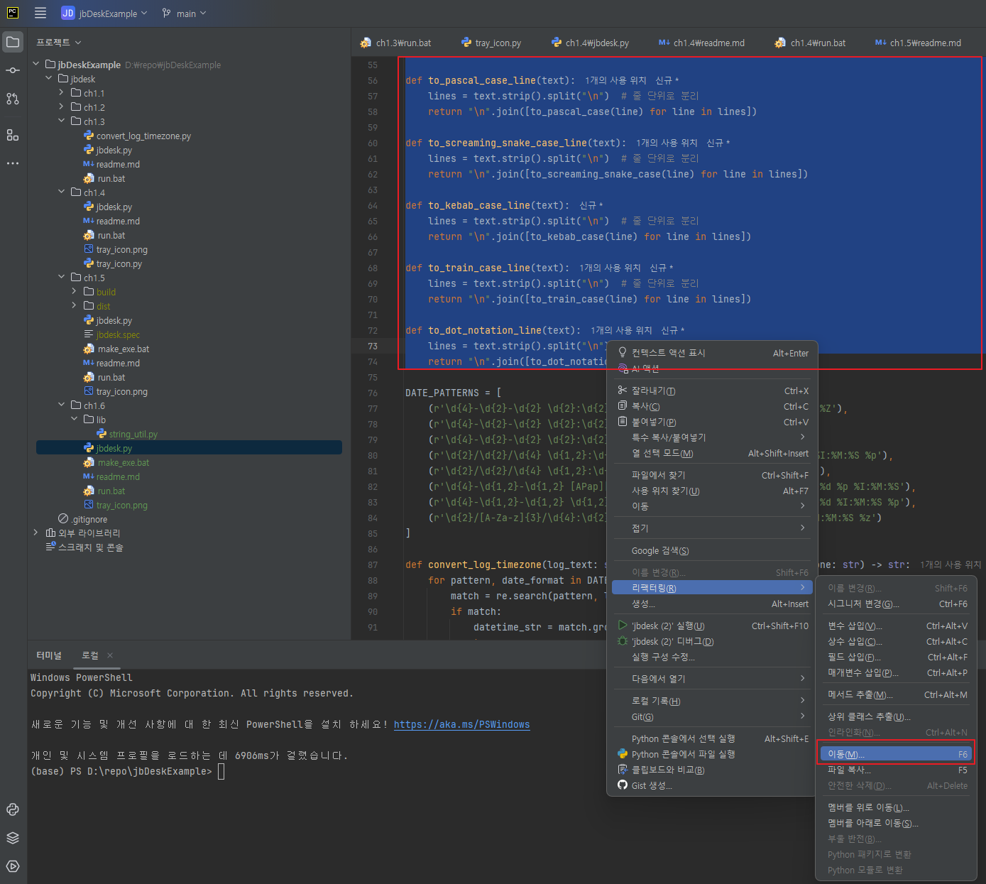그리고 jbdesk.py 에서 다음과 같이 to_pascal_case_line 과 같은 string 관련 유틸리티 method 를 마우스로 선택 후에