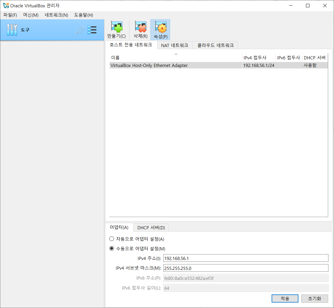 어댑터 탭을 보면 수동으로 어댑터 설정이 되어 있습니다.
