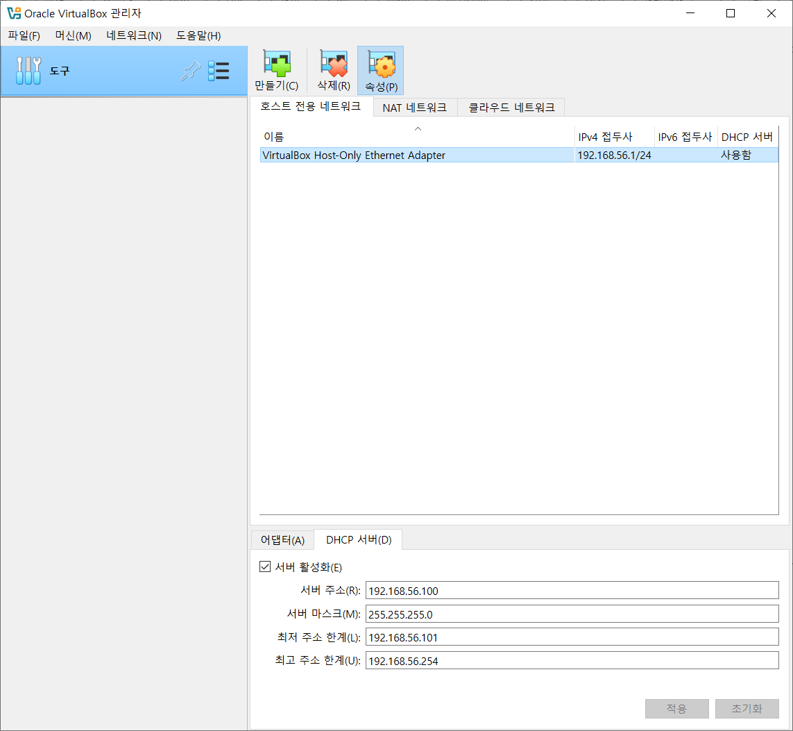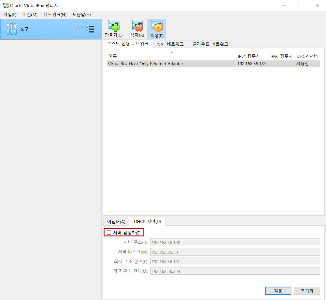 아래와 같이 DHCP 서버 활성화를 체크해제하여 비활성화 시킵니다.