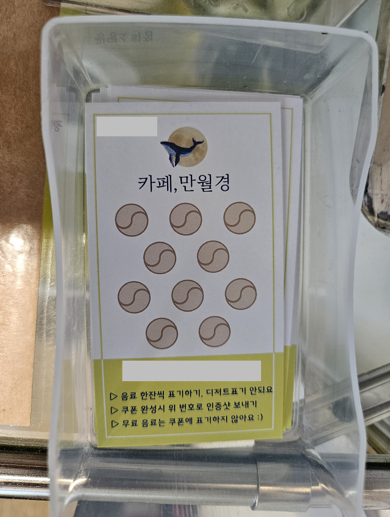 실제로 카페 만월경 쿠폰 사용 방법이라는 유튜브를 보면 휴대폰으로 QR 코드를 찍고 주문을 한 후에 쿠폰에 도장을 1개 찍더라구요.