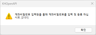 만약 계좌비밀번호가 저장되지 않은 상태에서 주문이 실행되면 아래와 같은 오류가 발생합니다.